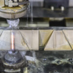 Wire EDM uses a thin, electrically charged wire as an electrode to erode the material along a programmed path. This process occurs in a bath of deionized water, which cools the material and flushes away debris. Key features include: